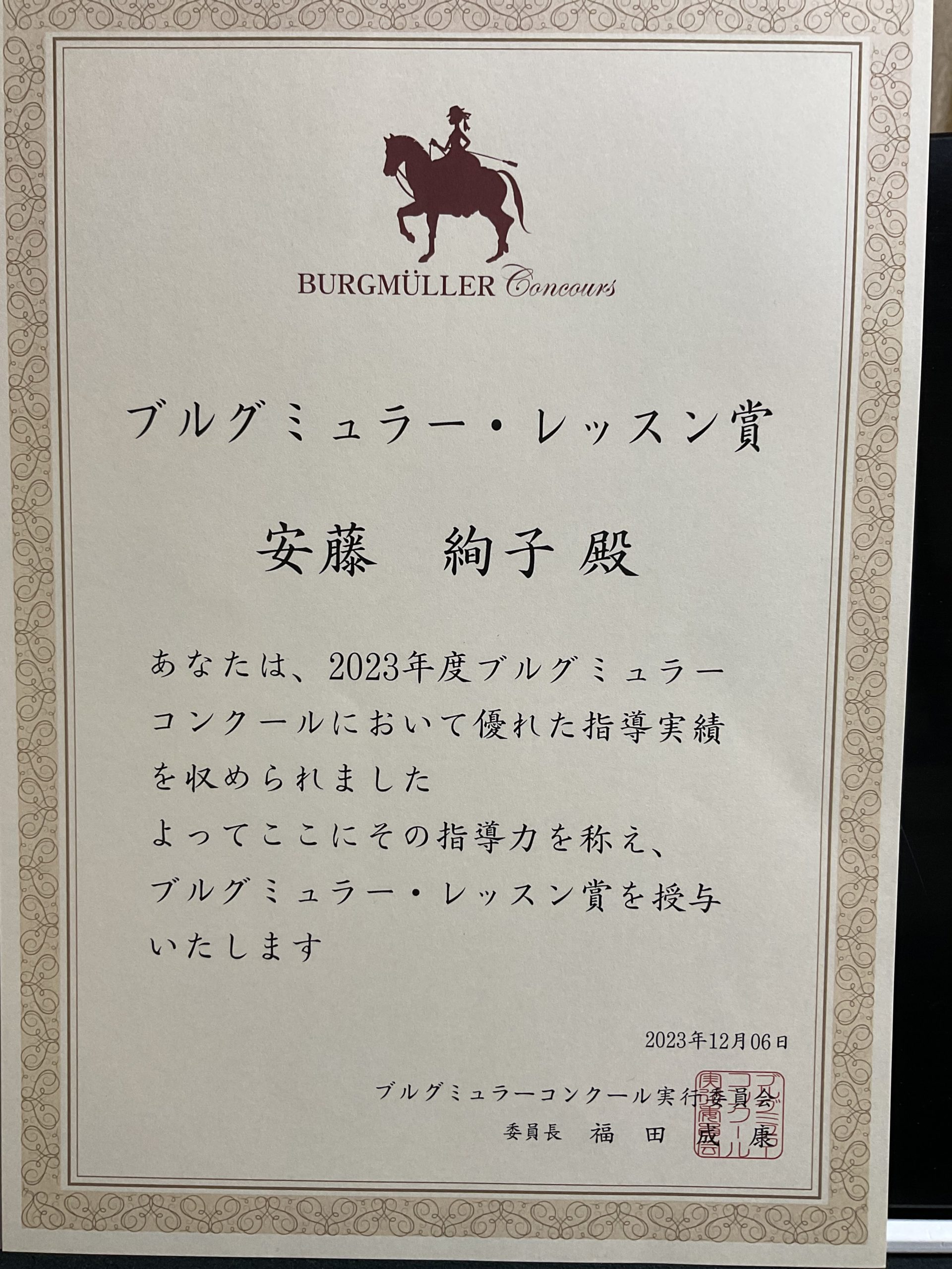 皆さんと、ご家族のサポートのおかげで私にも、ブルグミュラー・レッスン賞の賞状が届きました。ありがとうございました。